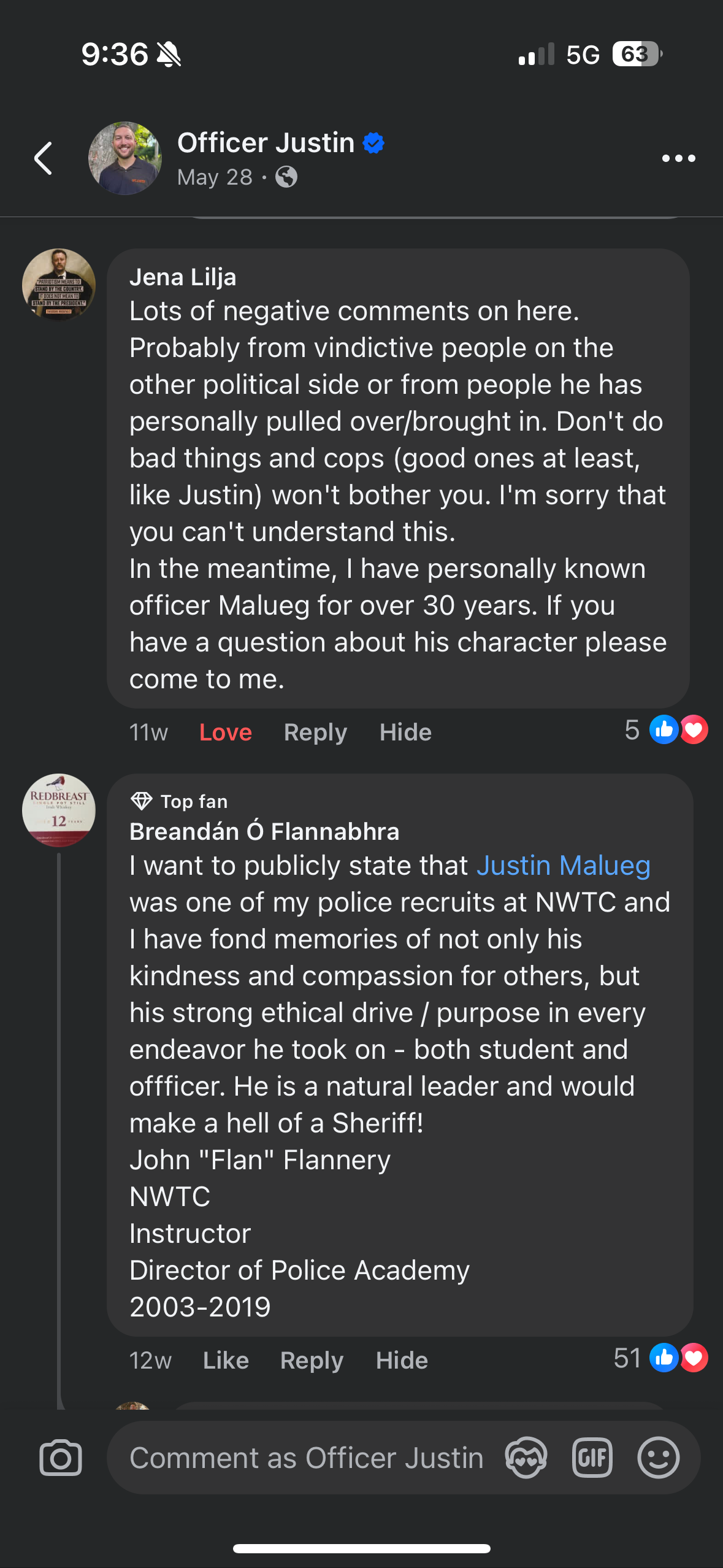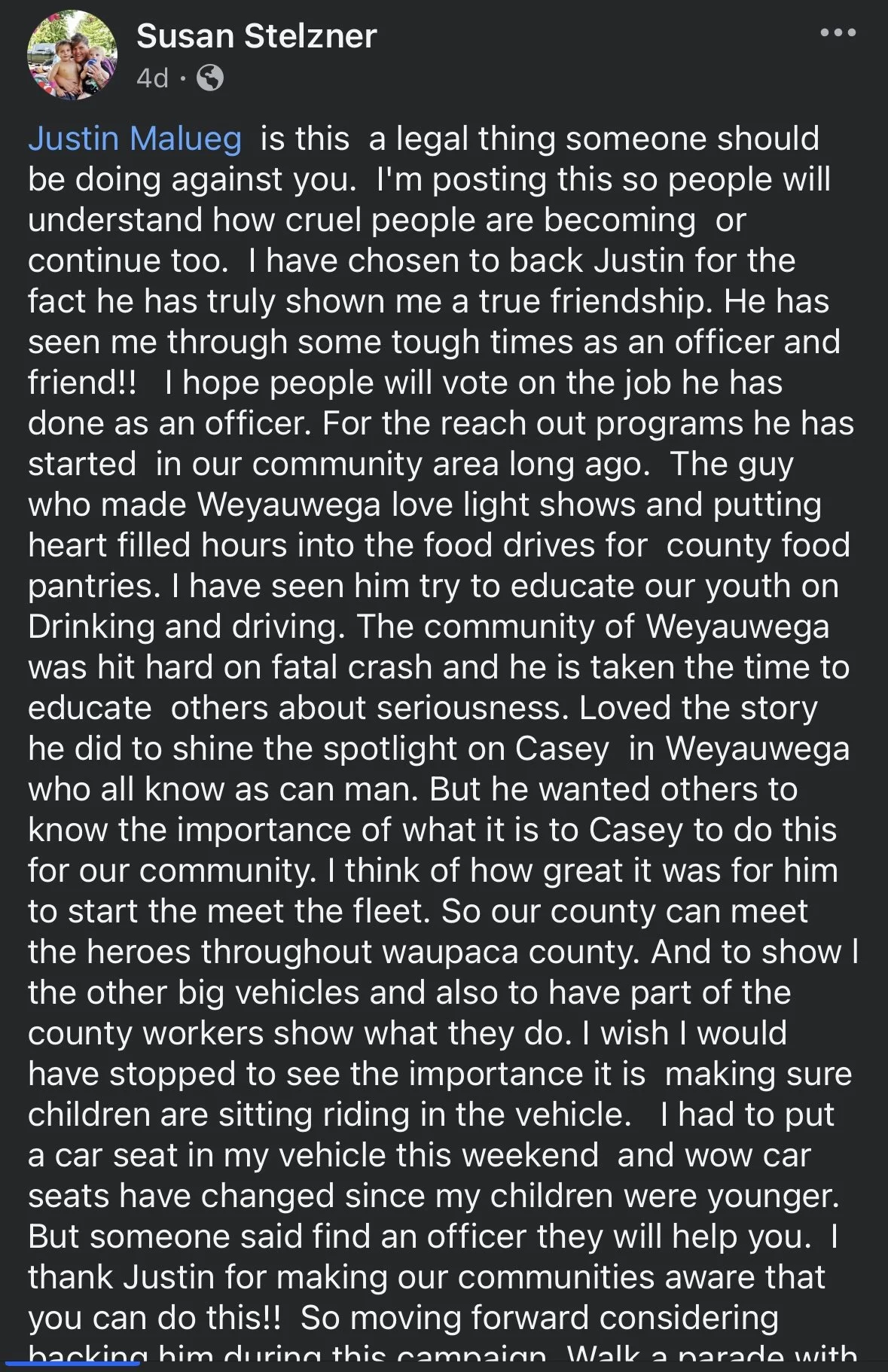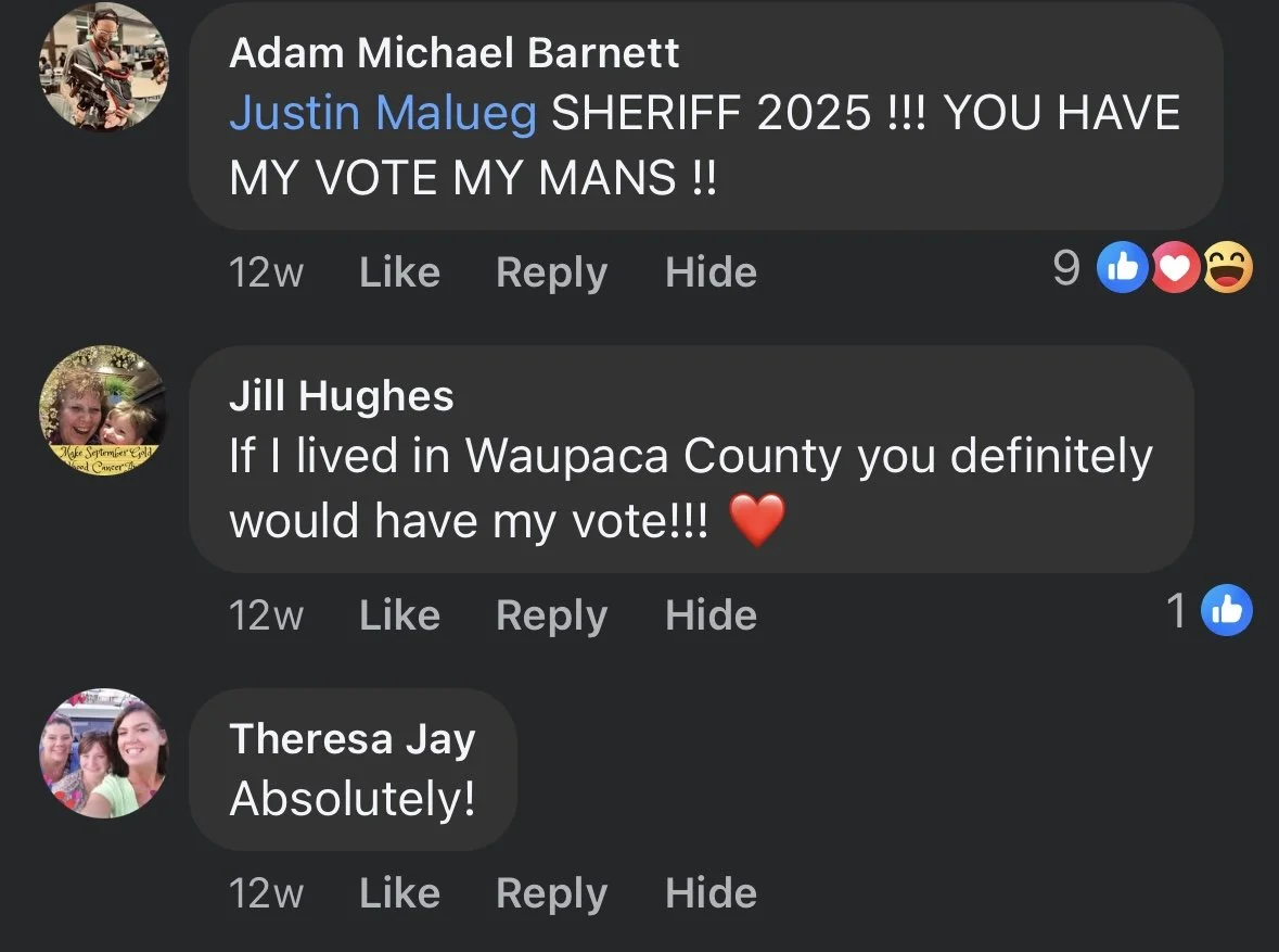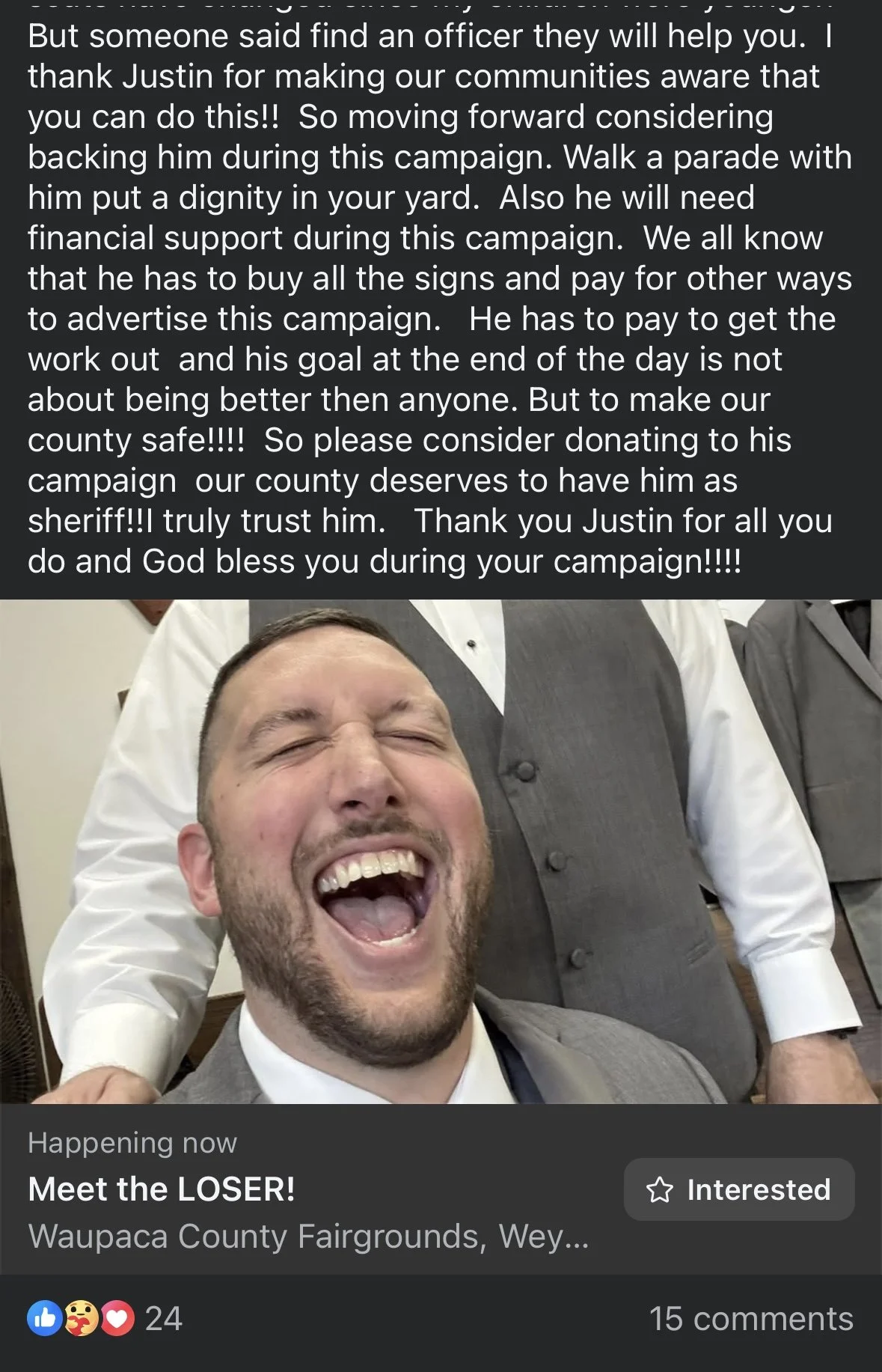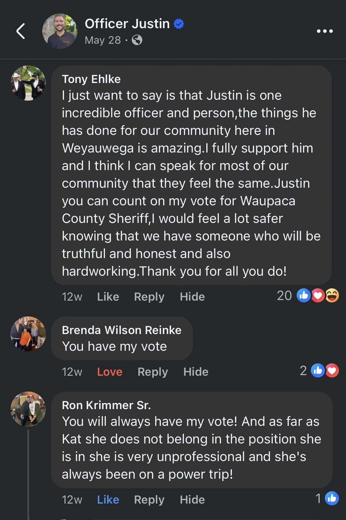 “Hey Justin, I know we have a small rough patch from when you first started here in wega, but I think we both know it's due to who they had you training with. I've known since I was very young that waupaca County was and still is beyond crooked and I'll be voting for you 100% if you want to put a yard sign in my front yard or let me know when I could pick one up I'd like to have one out to support you man.”