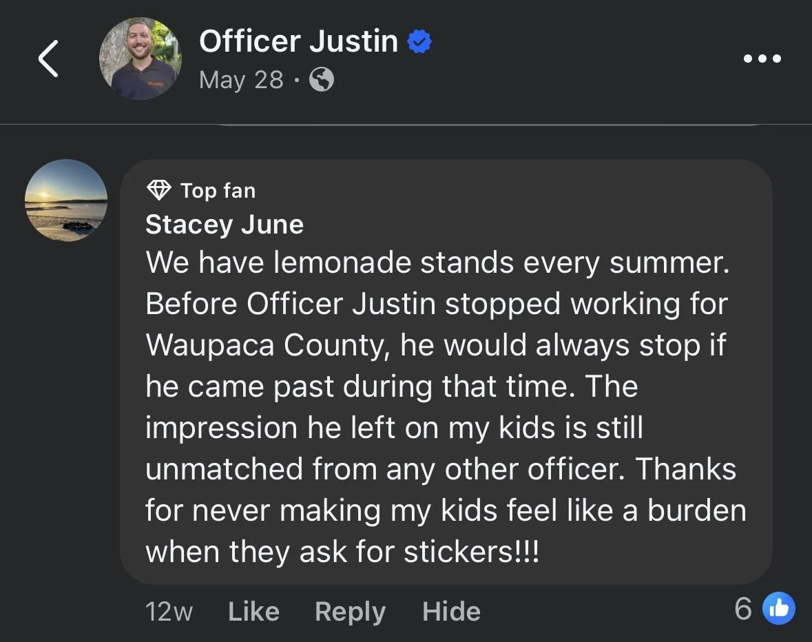 “Hey there, we live by *** and my kids always talk about you. Now we are all wondering where you went! Are you still working for Waupaca County Sheriff Dept or did you go somewhere else? You left a lasting impact on my kiddos.”