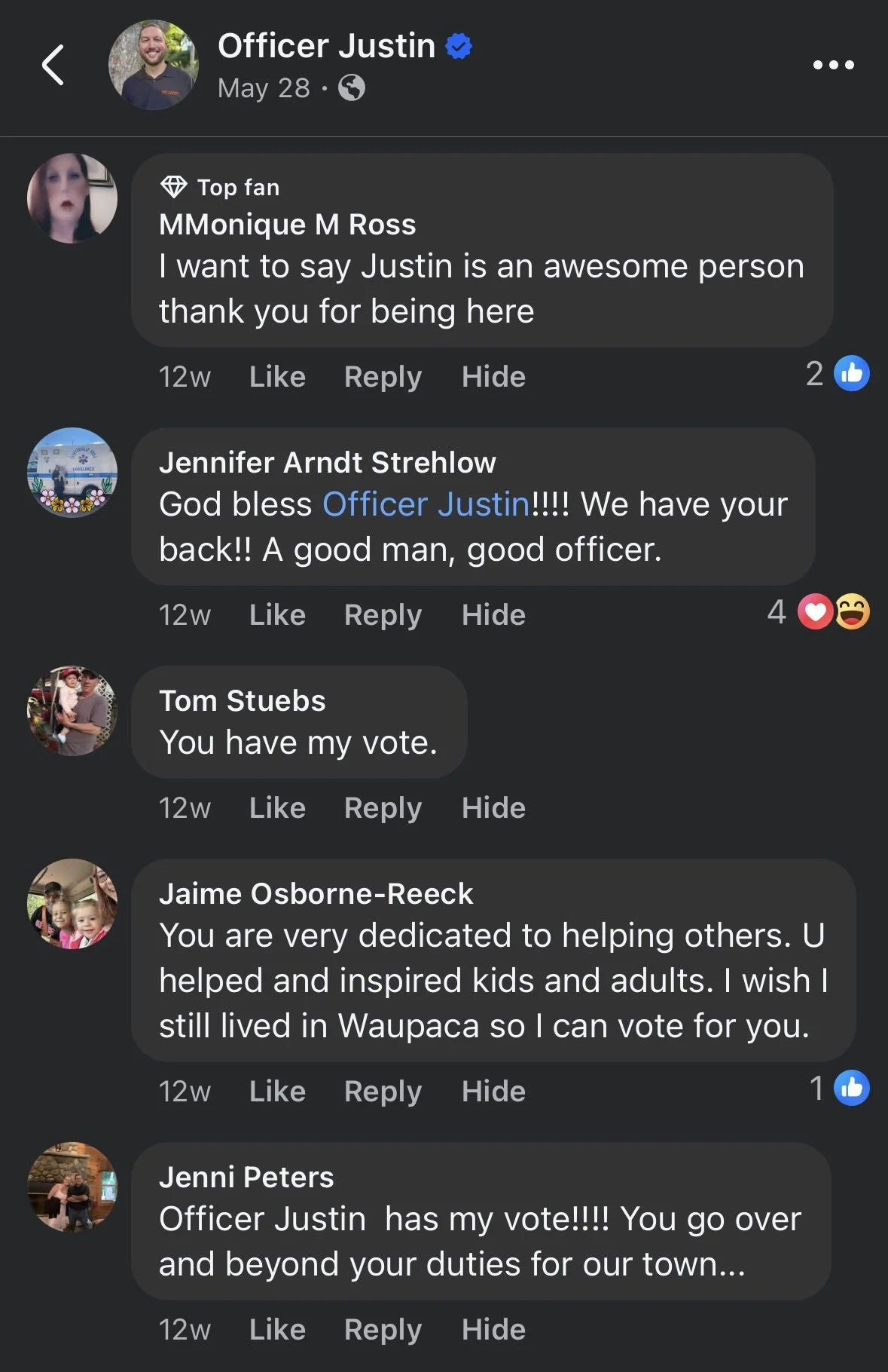 ”Officer Justin, as someone who is working towards the goal of becoming a deputy for the Waupaca County sheriff’s department, I would love nothing more than to have someone as dedicated and compassionate as you for a Sheriff. You have my vote! thank you for all that you do.”