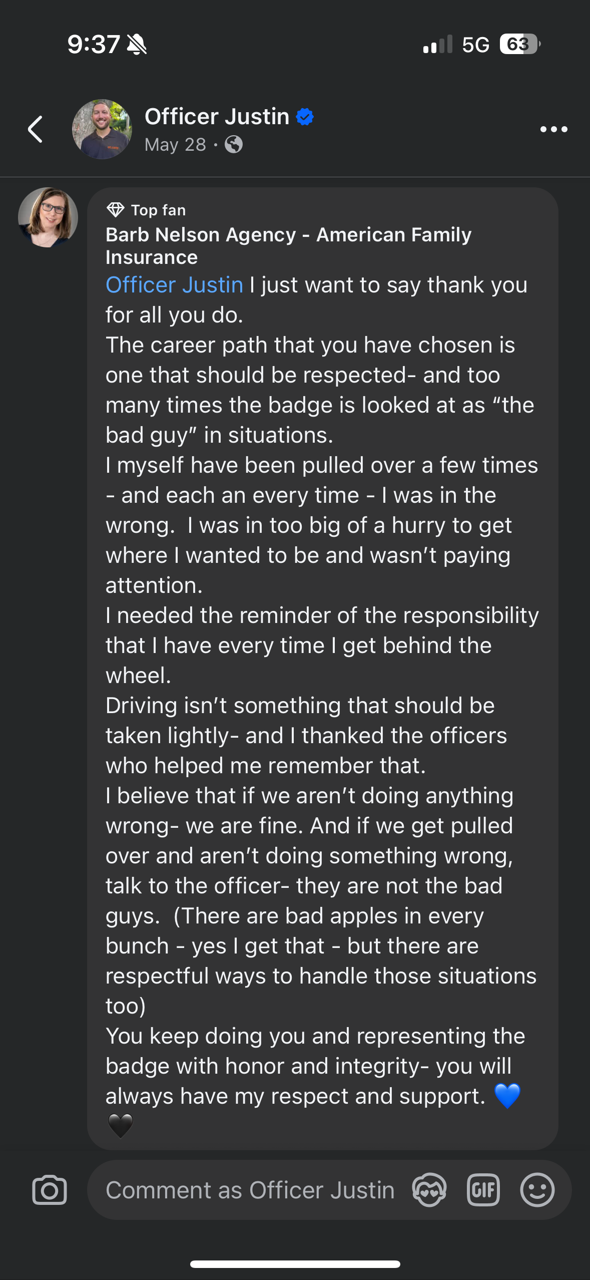 “Hey Officer Justin! My address is *****. I also wanted to take the time quick to thank you as well for everything you have done and continue to do. Your job is by far a hard one, and you definitely do not get enough credit foe everything you do every single day, by just putting your life on the line to ensure everyone else is safe. Your dedication to keeping us safe does not go unnoticed. You’re courage is something to be admired. I work for ccs **** county for individuals that are on a chapter 51 commitment ....during crisis, officers are the only ones I can rely on to not only keeping my individuals safe, but me as well. Keep on doing what you’re doing. I love that you’re an open book, very cool. Congratulations on the recent marriage! She’s gorgeous! You’re right, the truth will prevail!”