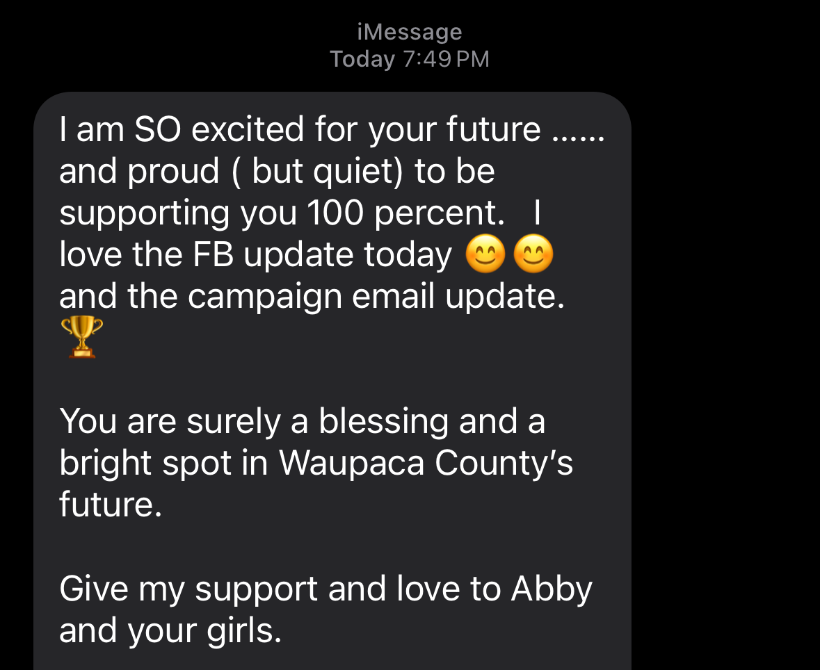 “I would like to help with your campaign in anyway you’d need. I have 10+ years of people management, 15+ years of customer service experience and a pretty well connected pod of people in the Waupaca Area. Please let me know if you’d like my help and id love to talk of how I could be a benefit to you! Have a great day!”