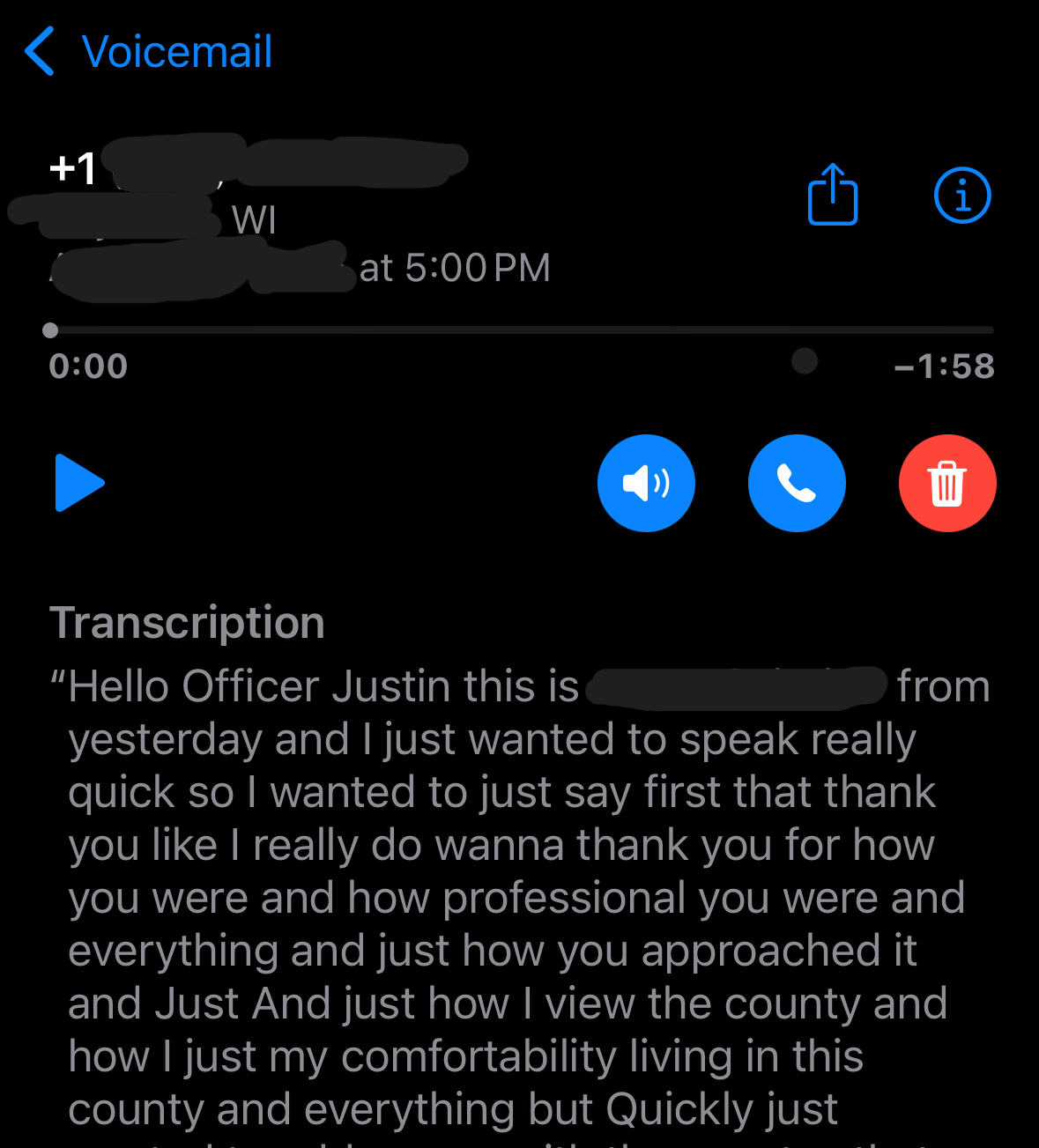 “Hello Officer Justin, this is **** from yesterday and I just wanted to speak really quick. So, I wanted to just say first that thank you.. like I really do wanna thank you for how you were and how professional you were and everything and just how you approached it and just and just how I view the county and how I just my comfortability living in this county and everything…”