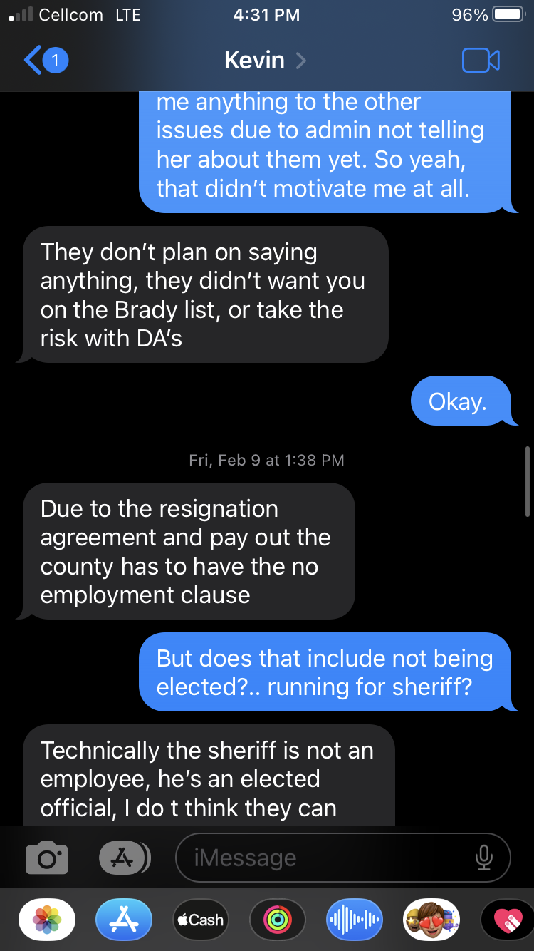 I told Kevin that I would like to end the interview so I could resign, because I did not want to jeopardize my career or my court cases with a Brady violation. We both walked out together and informed admin that I would be resigning. Kevin said he would be in touch with me about getting a resignation agreement typed up and signed. I thanked him and then departed from the sheriff’s office.